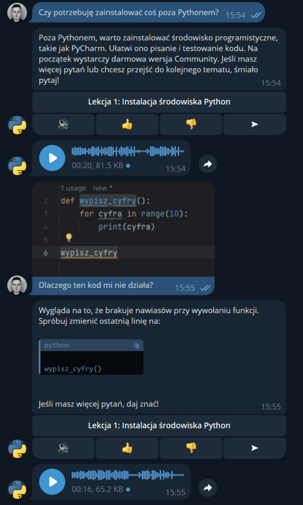 Dzięki temu, że AI posiada wiedzę eksperta, kursant może w swobodny sposób uczyć się ze swoim Mentorem AI, zyskując dostęp do eksperckiej wiedzy w każdej chwili.
